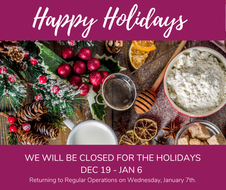 WE WILL BE CLOSED FOR THE HOLIDAYS DEC 19 - JAN 6. Returning to Regular Operations on Wednesday, January 7th.